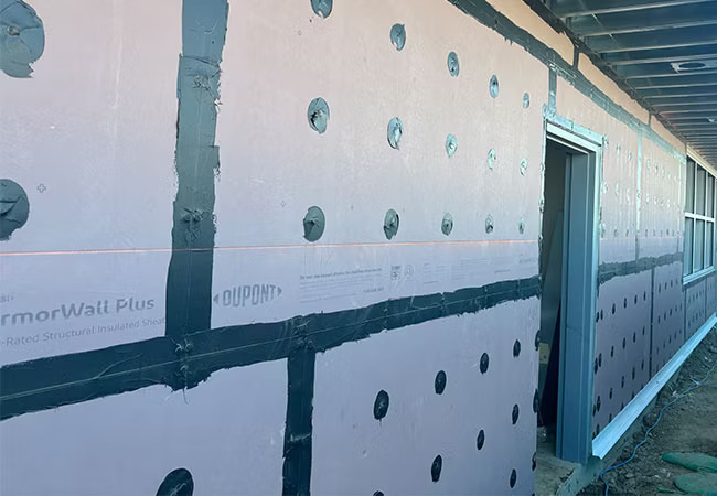 The DuPont ArmorWall System is a premium, high-performance wall solution, incorporating five traditional building enclosure elements: structural sheathing for direct cladding attachment, fire-resistance, continuous air barrier, water-resistive barrier, ultra low-GWP continuous insulation layer. The ArmorWall™ System enables multiple cladding attachment points virtually anywhere on the panel without requiring attachment back to the stud frame assembly or substrate.